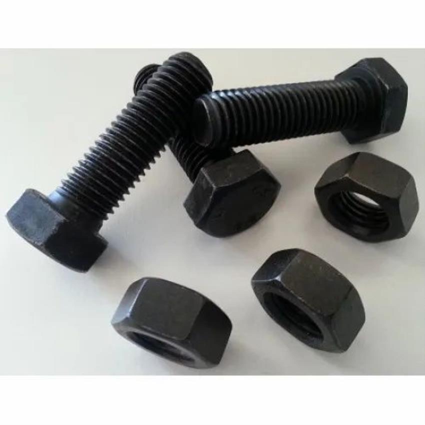 Hexagonal head metal bolt and nut. Available in brass, steel, or nickel. Grades 8.8 to 12.9. Various finishes including zinc plated.