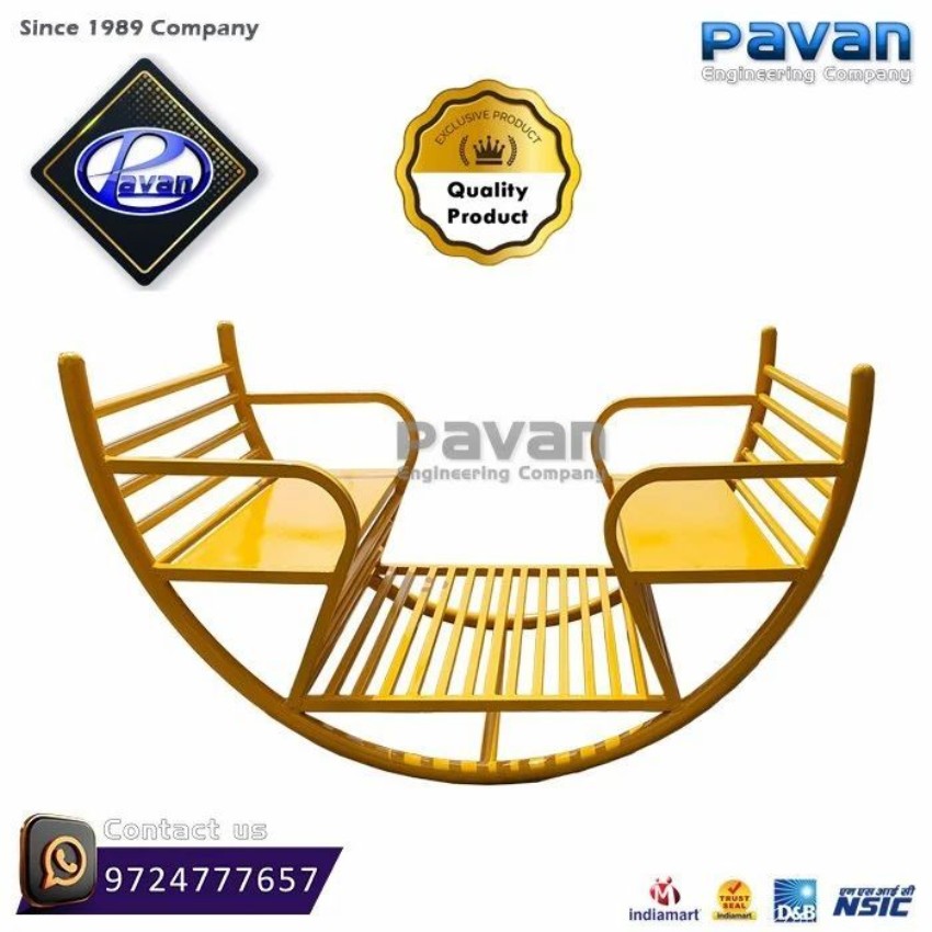 Four-seater outdoor metal swing playground equipment. Features heavy metal seats and a durable yellow finish. Designed for safe and active play.