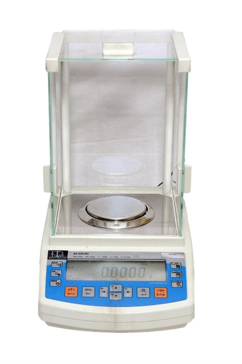 Metal analytical balance with 200gr rated load and 0.1 mg accuracy. Features a digital display and a capacity up to 1 kg for laboratory use.