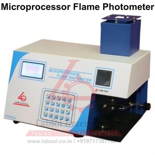 Flame photometer with 5-point calibration, LCD display, Na 0-100 ppm range, and photodiode detector. Operates on LPG and oil-free air, with RS232 interface. Weighs approximately 8 kg.