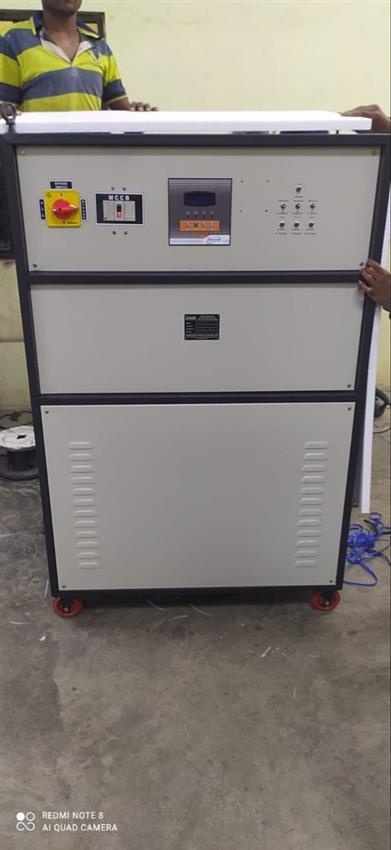Three Phase voltage stabilizer, 30 KVA capacity, input voltage range 360-480V. Floor mounted, 1-year warranty. Ideal for industrial applications.