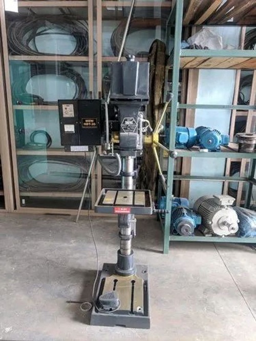 Semi-automatic mild steel machine for drilling (20mm steel) and tapping (12mm steel). Features 125mm spindle travel, MT-2 taper, 2850 RPM max speed, and 1 HP motor.