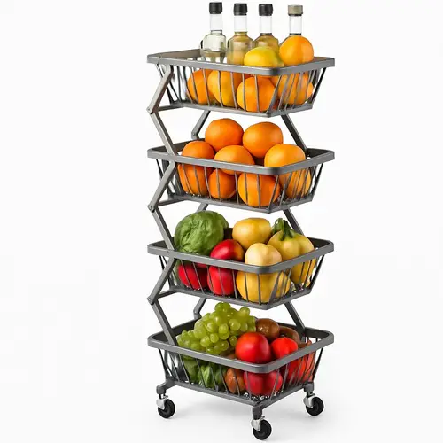 Powder coated mild steel 4-layer fruit basket trolley. Made in India, this trolley offers durable and versatile storage for fruits and vegetables.