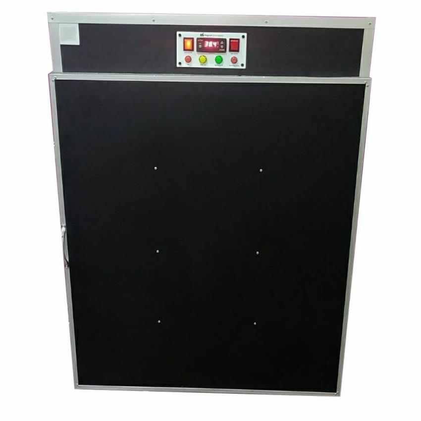 Mild steel automatic egg incubator for poultry farms. Operates on 240V, 50Hz single phase, with a 200-egg capacity and automatic turning.