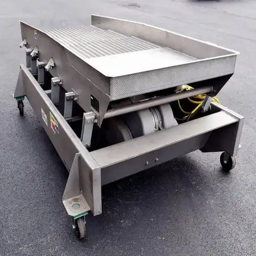 Automatic mild steel vibrating conveyor, 10m length, 50 kg/ft capacity. 15 HP motor, 380V electric power. Inclined design for machine feeding in packaging applications. Made in India.