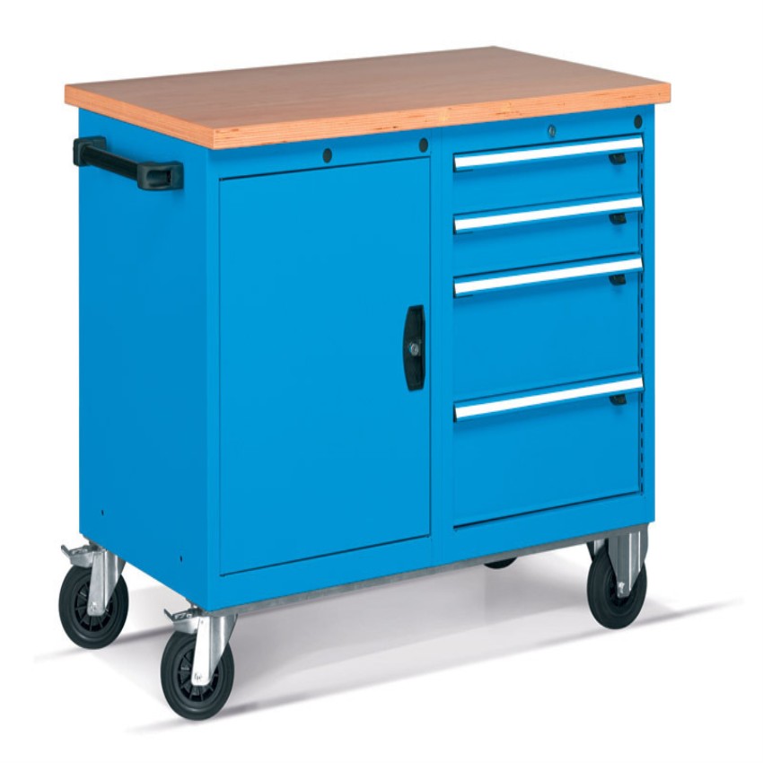Rectangular mild steel tool cabinet in blue, designed for industrial applications. Features 4 drawers and 4 wheels for mobility. Made in India.