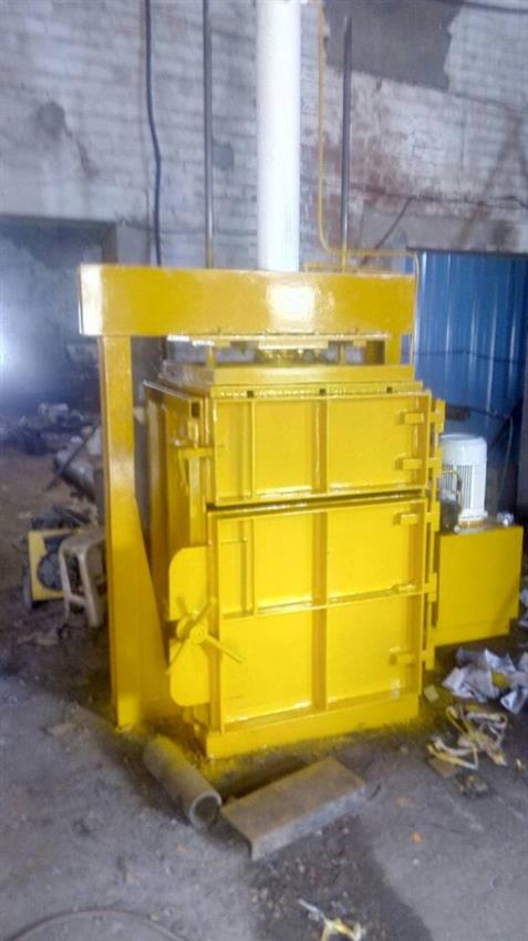 Semi-automatic hydraulic baling press for industrial use, designed for raffia and cement bags. Constructed from mild steel with up to 150 ton capacity, powered by hydraulics.