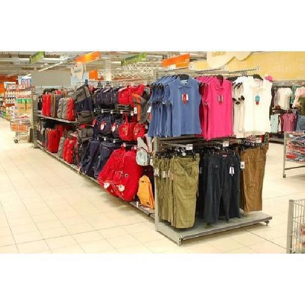 Foldable, free-standing mild steel clothes display rack for showrooms. Features sleek design, color-coated finish, and adjustable height (5-7 ft). 1-year warranty.
