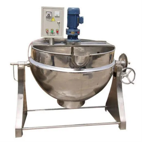Mild Steel cooking vessel for the food industry. Features three-phase motor, capacity up to 5000ltr, and manual or hydraulic tilting. Includes a Teflon scraper.