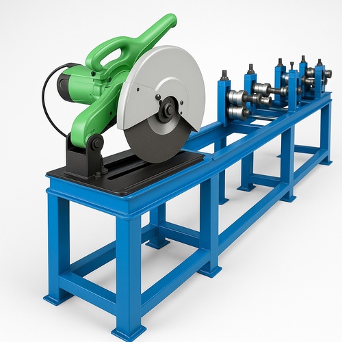 Automatic mild steel door frame rolling machine with hydraulic cutting. Processes 0.5mm thickness, 100mm max sheet width. Daily capacity of 1 ton. Made in India.