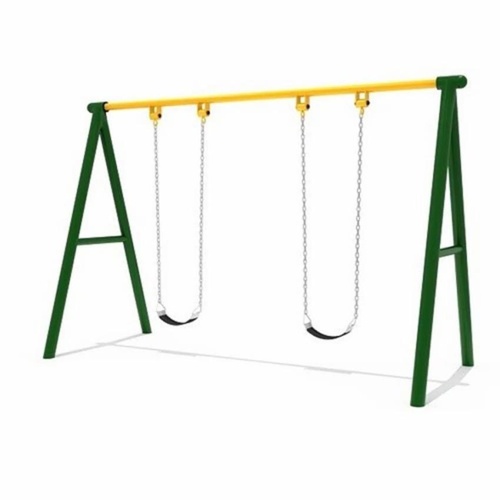 This mild steel outdoor playground swing offers seating for 2. Features a rubber belt seat and is designed for outdoor use. Color options available. Made in India.