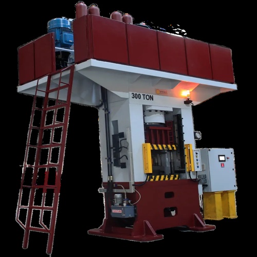 Semi-automatic 300-ton mild steel open die forging press. Features 24V, 3-phase electrical power, industrial application, and shot blasted surface treatment. Made in India.
