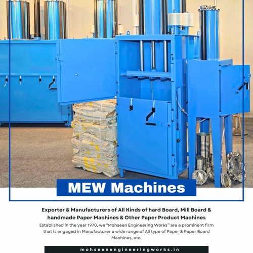 Semi-automatic mild steel hydraulic baling press for corrugated boxes. Features 20-ton load capacity, 3 HP motor, and 24"x18" bail size. Fabricated blue unit with 50-liter oil tank.