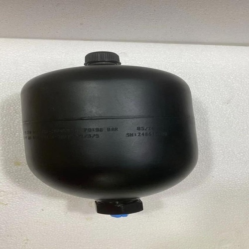 Mild steel cylindrical hydraulic diaphragm accumulator. Rated for 100 Bar pressure, suitable for general hydraulic applications. Durable construction in black finish.