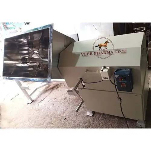 Semi-automatic mild steel mass mixer with 100 Kgs capacity. 5 HP motor, 1440 RPM stirrer speed. Designed for industrial powder mixing applications in India.