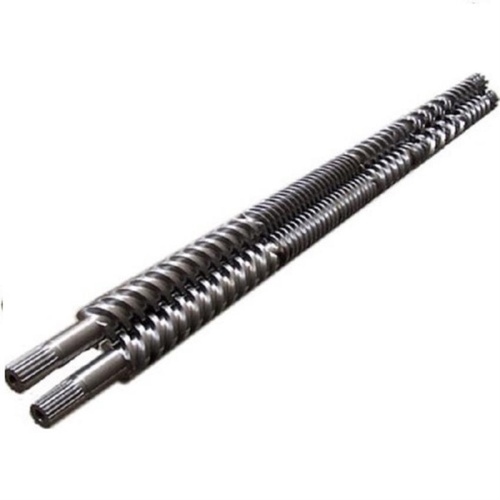 Mild steel parallel twin screw for plastic processing machines. 5000 mm length with 0.8 mm nitride depth. Corrosion resistant. Minimum order quantity is 1 piece. Packaged in a box.