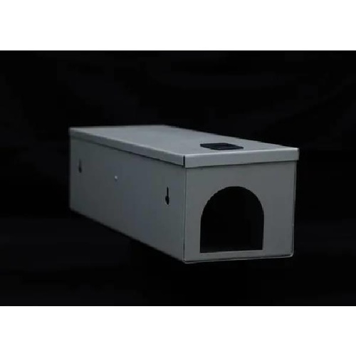 Rectangular mild steel rodent bait box, grey and black. Dimensions: 340mm(L) x 130mm(W) x 115mm(H). Designed for effective rat trapping.