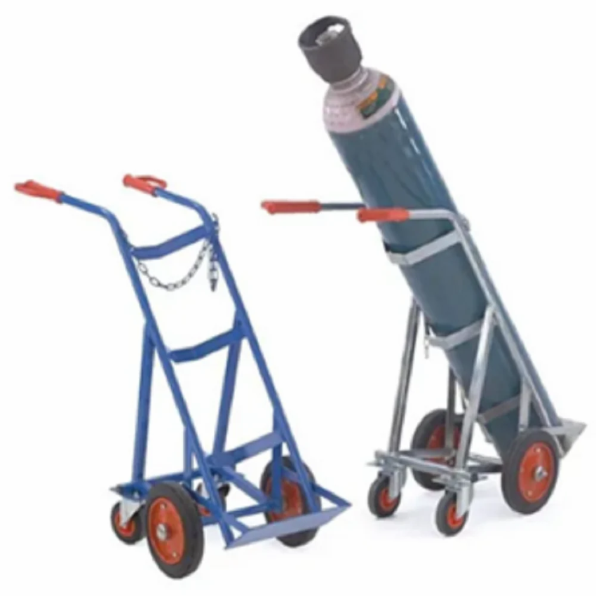 Mild steel hospital cylinder trolley in blue. Designed to hold one oxygen cylinder. Ready stock for immediate dispatch. Ensures secure cylinder transport.