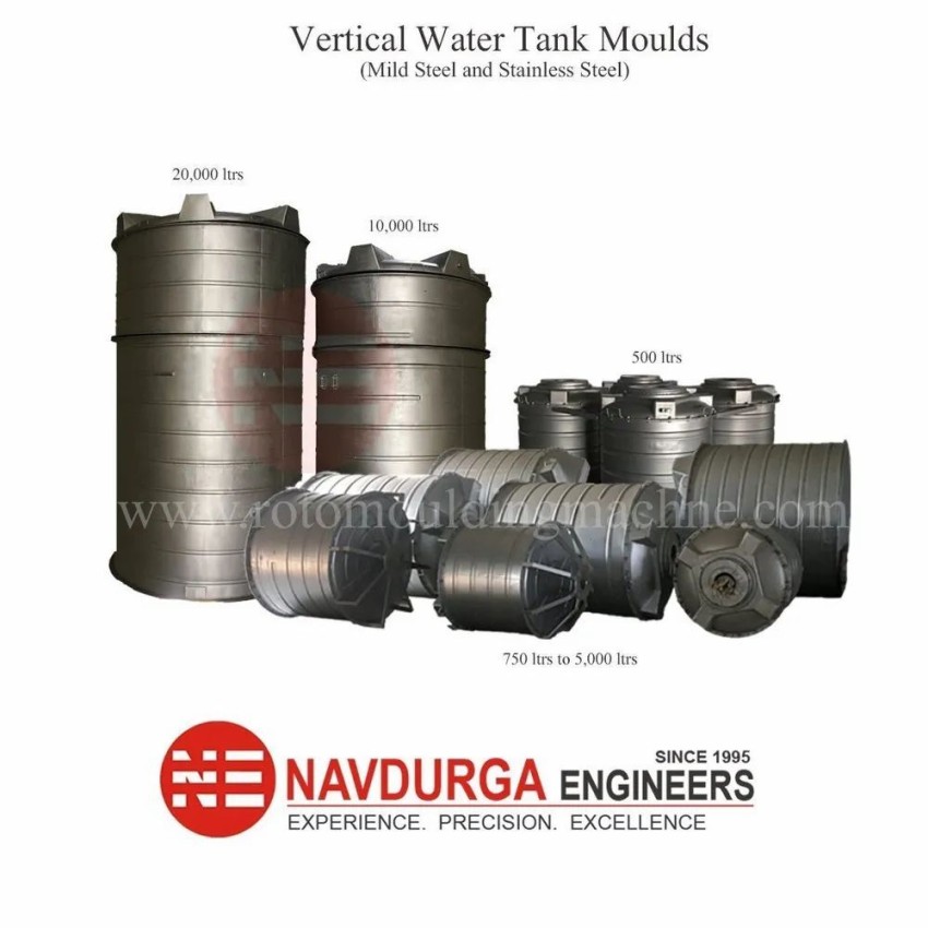 Vertical water tank mould for plastic tanks, 100-25,000 Ltrs capacity. Constructed from mild steel and stainless steel. Silver color, made in India.
