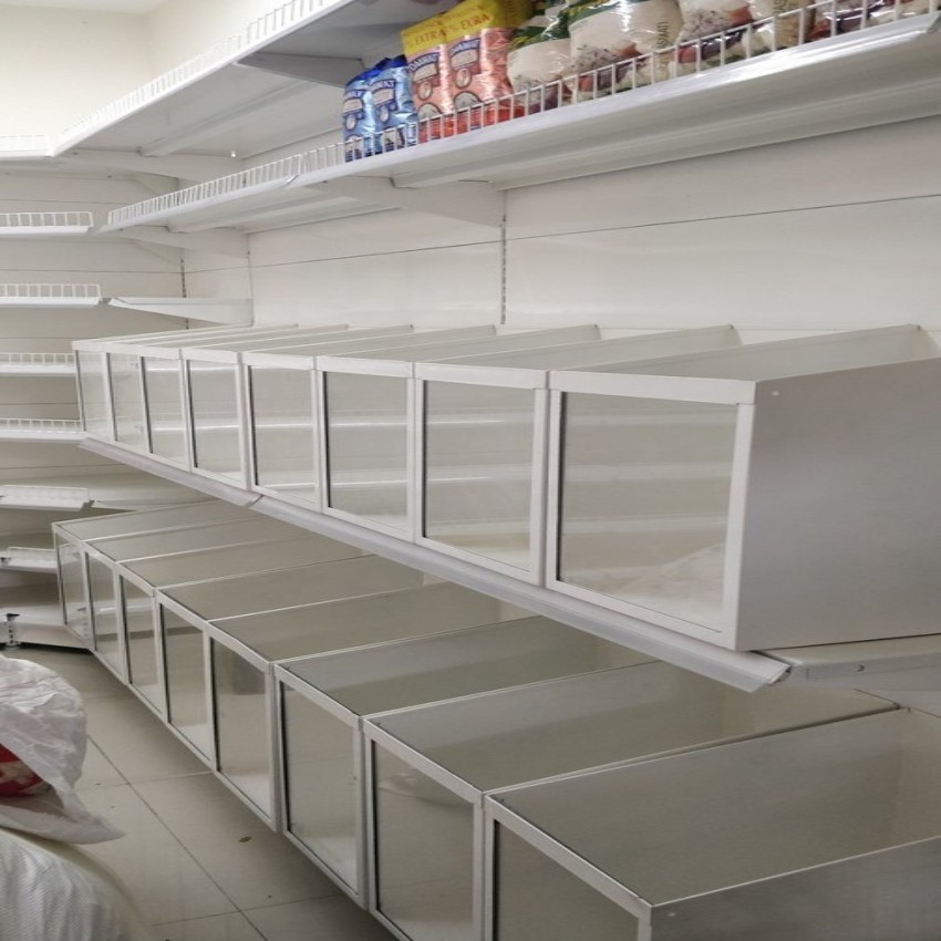 Powder-coated mild steel supermarket rack, 7-8 feet tall, with 3 shelves. Designed for grains display, this free-standing unit has a weight capacity of 100 Kg.
