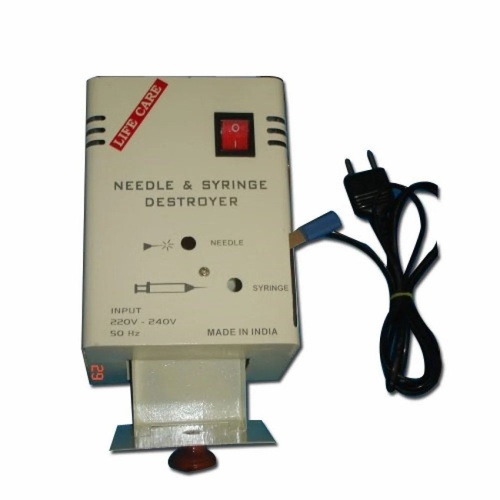 This hospital-grade needle destroyer is constructed from mild steel, featuring a 250W power output and operating at 50 Hz and 220V. Its rectangular shape is designed for efficient syringe disposal.