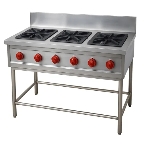 Mild steel three burner gas stove for LPG. Features high power burners and manual ignition with knob control. Robust design for reliable commercial kitchen performance.