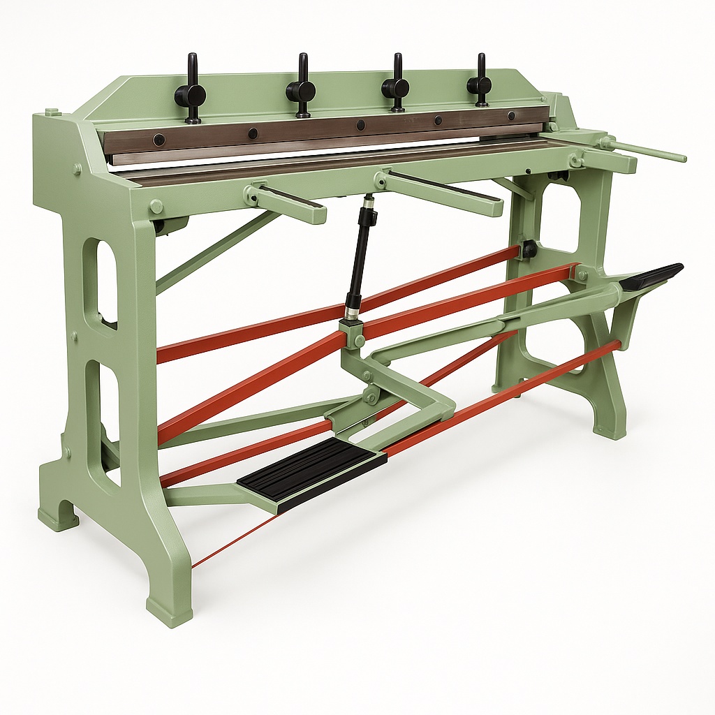 This treadle shearing machine is constructed from mild steel. Ideal for various shearing tasks requiring precision and durability in metal fabrication.