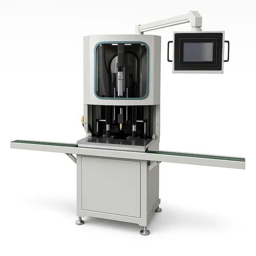 Automatic CNC corner cleaning machine, Model SQJ-CNC-120B-3. Mild steel construction, 0.5-0.8MPa air pressure. Two-axis computer control for 20-120mm cutting width. 700kg weight.