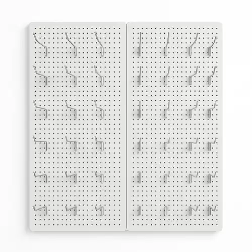 3ft tall, 2ft wide mild steel wall-mounted rack for departmental stores. Features 28 hooks, paint-coated finish. Assembly required. Made in India.