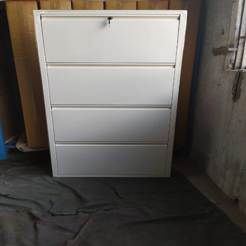 White mild steel shoe rack with powder-coated finish. Features wall mount design, 3 shelves, and 4 doors. Includes a drawer for added storage.