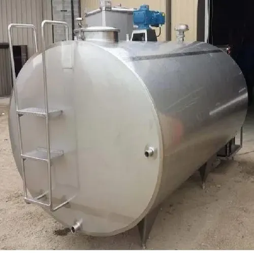 Horizontal milk storage silo, 5000 L capacity. Constructed from SS304 stainless steel with a polished finish for hygienic milk storage.