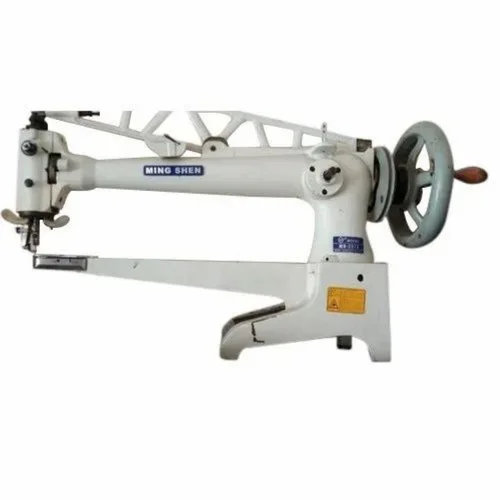 Compact electric sewing machine for home use. Features multiple stitch patterns and adjustable speed for various fabric types. Easy to operate for quick repairs and small projects.