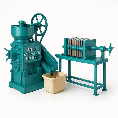 Semi-automatic mini oil extraction equipment with 125-140KG/hr capacity. 12.5 HP power, MS material, highly efficient design. Made in India, includes electric motor.