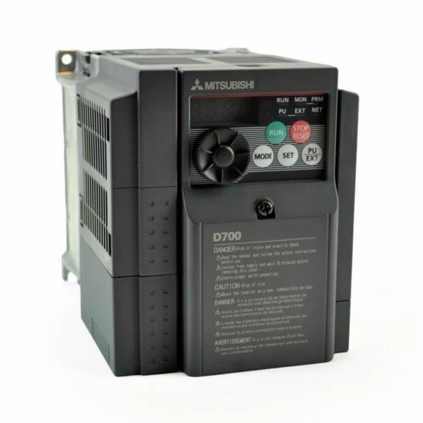 This 3-phase VFD operates from 380-480V, powering motors up to 0.4 HP. It features self-cooling and a 50/60 Hz input frequency. Model FR-D740-K-0.4 for industrial automation.