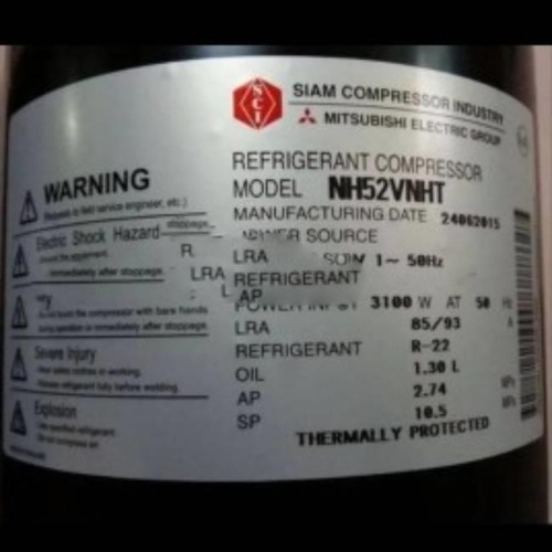 Mitsubishi Rotary Compressor for air conditioning. Operates on 380-415V/3Ph/50Hz. Uses R22 refrigerant. Fixed speed technology with 3.0 Ton capacity.