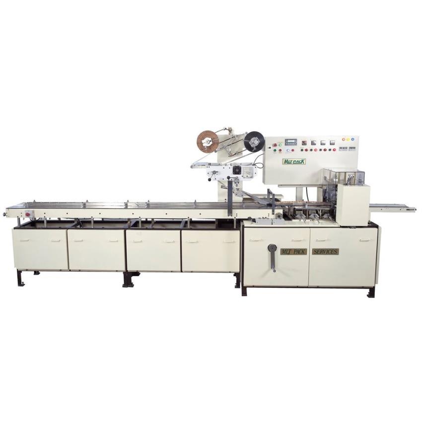 MLT Pack semi-automatic chikki packing machine. 2 HP electric driven, 60 PPM speed, handles wrappers up to 300mm wide, 325mm reel diameter.