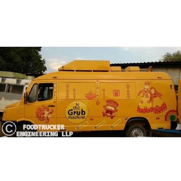 Movable food van with stainless steel kitchen. Features color-coated finishing and fire safety equipment including extinguisher and signage. Runs on diesel or petrol.