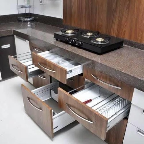 Polished silver stainless steel modular kitchen accessories. Grade 316 material ensures corrosion resistance. Plain design, ideal for modern kitchens.