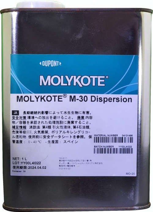 Molykote M-30 synthetic chain oil. Black liquid, 1kg unit pack size. Operating temperature up to 200°C. 120 mm²/s viscosity at 40°C. Flash point over 200°C.