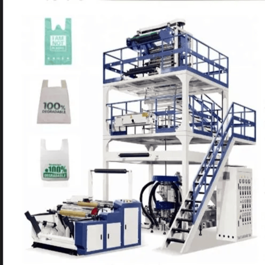 Mono Layer Film Blown Machine Plant for biodegradable bags. Features 10-13 ft tower, 5HP air blower, and 30-40 Kg/hr output. Bag film width 150-550 mm.