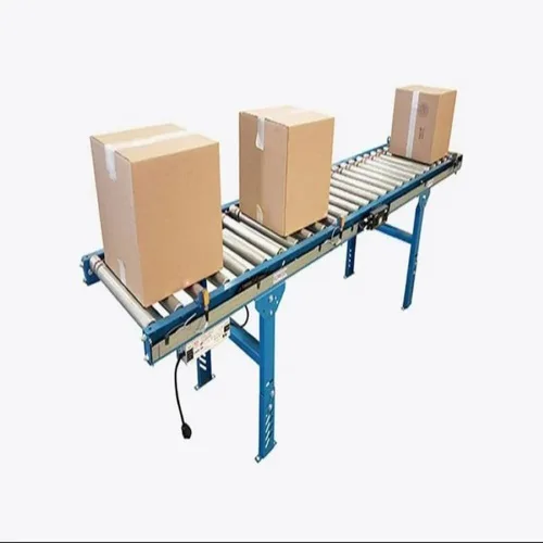 Motorized roller conveyor constructed from stainless steel. Features a polished finish, handling capacity up to 50 kg/feet. Ideal for moving goods in blue and silver.