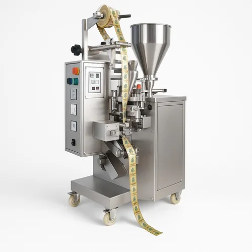 Semi-automatic mouth freshener packing machine. Capacity 500-1000 pouches/hour, 10-50g pouch capacity. Operates on 220V single-phase power supply.