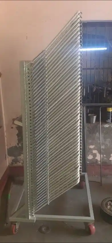 Movable rack for screen printing paper drying, constructed from powder-coated mild steel. Black color, 12.7mm thickness, capacity of 100 kg with 50 hooks.