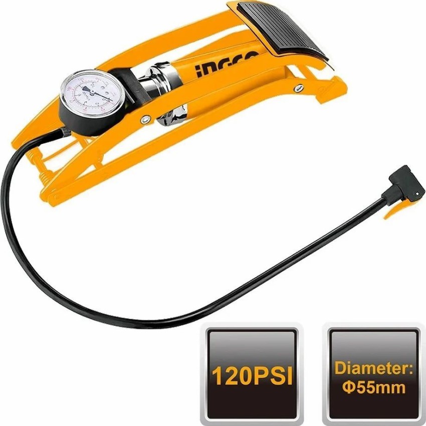 Ingco MPP5511 foot pump, powder coated surface finish. Achieves a pressure of 120psi. Size ranges from 55-120mm. Manufactured in India.