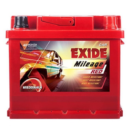 Exide Mileage Tubular Battery, model MR44LH. Features a red color and 44 Ah capacity. Manufactured in India.