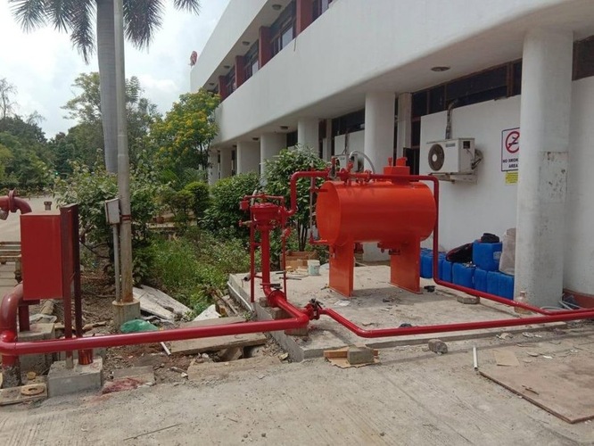 Automatic MS foam tank system for fire safety. Features a 1-inch deluge valve, 1000-liter capacity, and operates at 7 BAR working pressure. Powered by water.