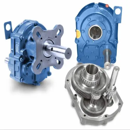 Mild Steel helical gearbox with shaft mounting. Features horizontal orientation and a 20:1 ratio, available in 6 sizes. Polished blue finish for durability and performance.