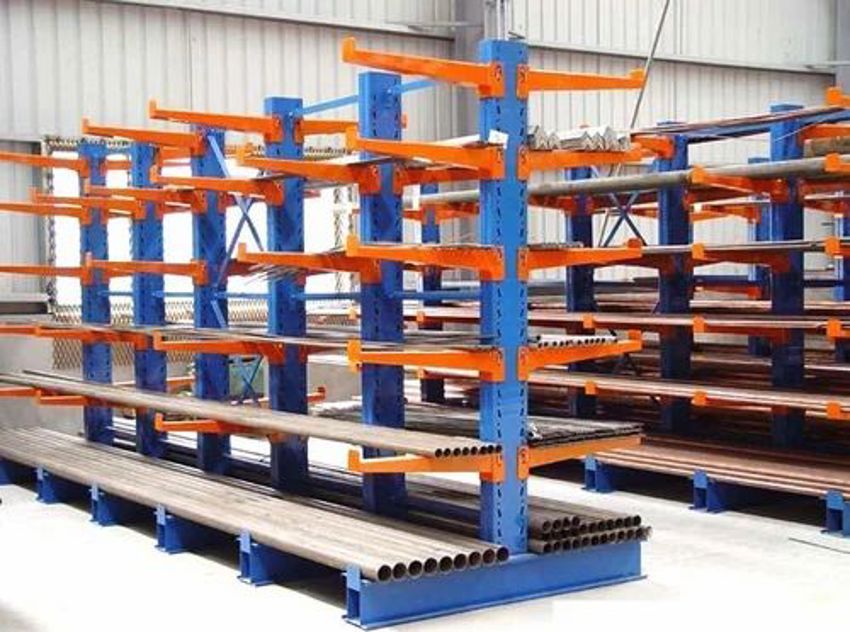 MS cantilever rack, 5-8 ft height, with 5 shelves. Mild steel construction ensures durability for industrial storage of various materials. Reliable and space-saving.