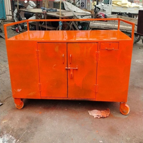 Orange MS tea counter with 2 shelves. Dimensions: 6.5 x 3.5 x 4 Feet. Color-coated surface finish, designed for selling tea.