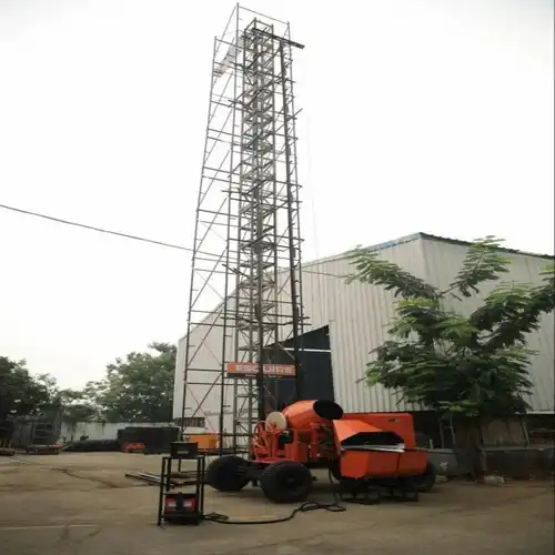 Paint-coated Mild Steel (MS) hoist rack. 2 Ton load capacity, 8m chain length, electric power. Designed for construction material and people transport.